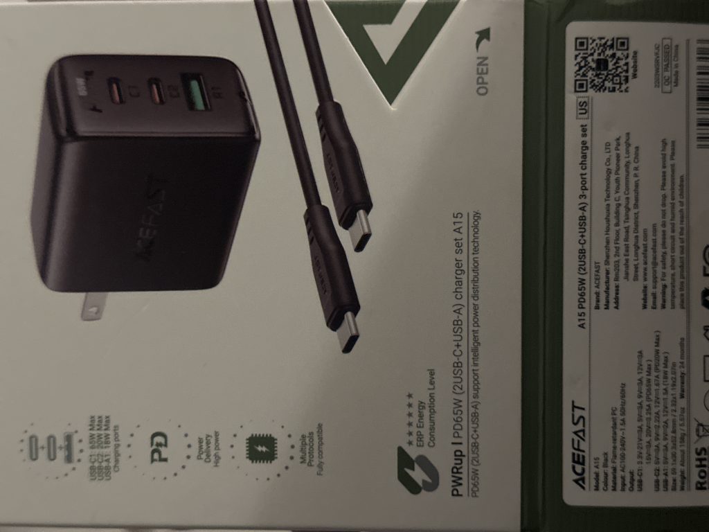- Acefast PD 65W GaN Fast Charge Wall Charger comes with Foldable AC Plug, Compact Size.High power output, compact size with foldable AC plug. ACEFAST PD65W Dual USB-C+USB A port power adapter +USB C to USB C charging cable set is designed to be taken anywhere and ready for travel.