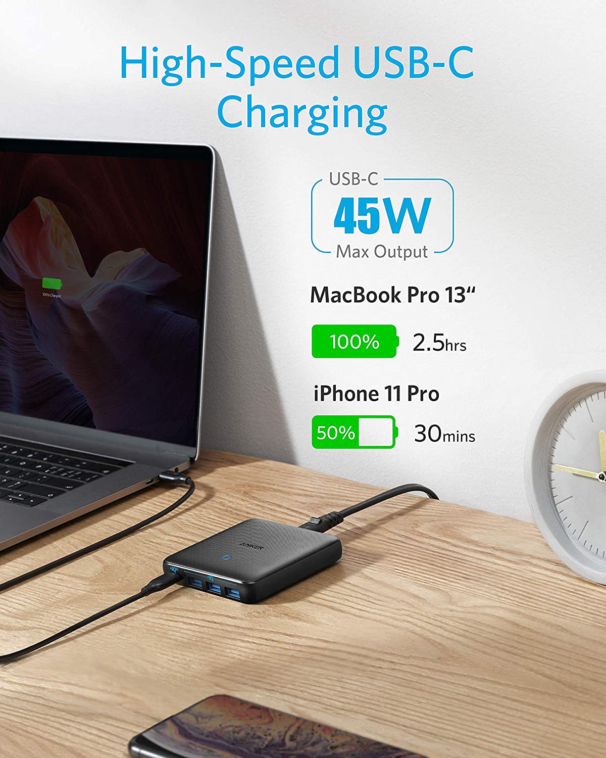 Use the 45W USB-C port to charge an iPad Pro 12.9” in 2 hours, or charge USB-C laptops including Dell XPS 13 and MacBook Air 2018 at full speed.