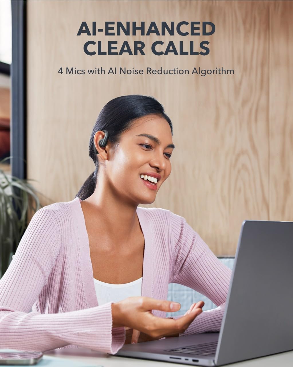 - Crisp Calls with 4 Mics and AI: AeroFit open-ear headphones feature 4 mics and an AI Noise Reduction Algorithm to offer pristine call quality for everyday conversations.