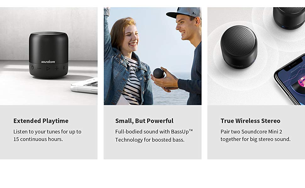 True Wireless Stereo technology makes it easy to pair your speaker with a second Soundcore Mini 2 for stereo sound with greater spatial depth and even bigger volume.