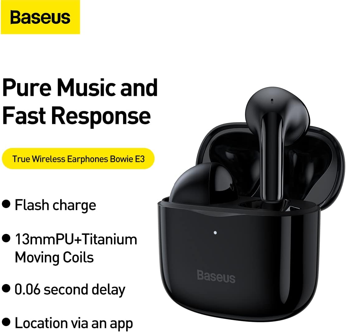 Baseus Wireless Earphone Bowie E3 Baseus Flash Charge technology enables you to charge the earphones for 10 minutes and play music for 2 hours.13mm full-range PU composite titanium-plated diaphragm audio unit offers well-balanced triple frequency and clear sound quality.