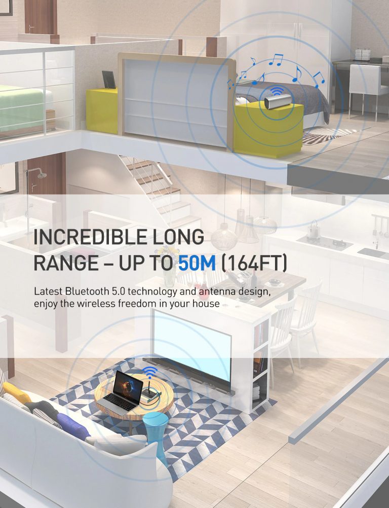 Bluetooth 5.0 makes this Receiver & Transmitter by MPOW one of the best in the industry. Upto 50 feet range thanks for the antenna design of this transmitter by MPOW.