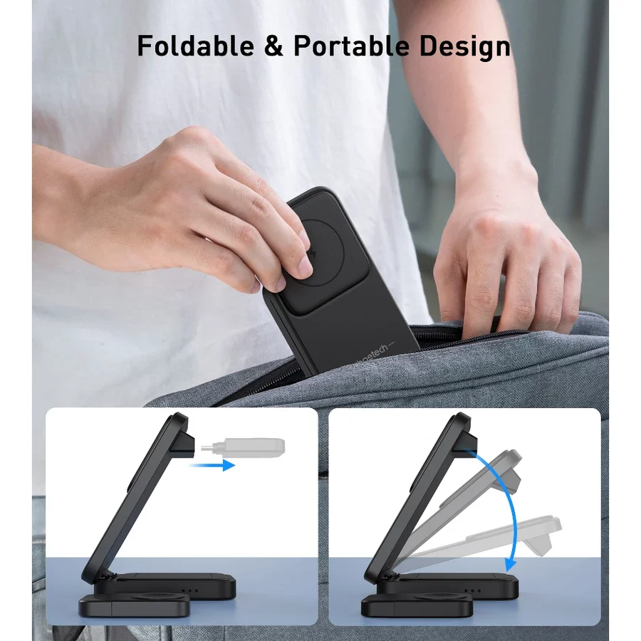 3-in-1 Magnetic Wireless Charging Stand: 15W Max Phone Output, 2.5W Watch Output, 3W Earbuds Output