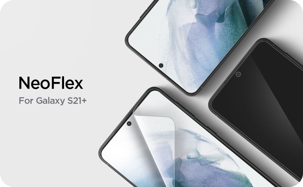 SPIGEN Neo Flex HD for the Samsung Galaxy S21 Plus is a set of 2 Screen Protectors made with Flexible Thermoplastic Polyurethane Film (TPU). Say no to scratches, rainbow effects and bubbles! Neo Flex HD is self-healing and easily applied with Wet installation via included spray. Simply give the Neo Flex HD a few spritz of its magic and within 24 hours you will find your screen clear as new. Its wet application ensures a strong adhesion and a bubble-free surface. Neo Flex does not affect the touch sensitivity of the screen and is in-screen Finger Print Sensor Compatible.