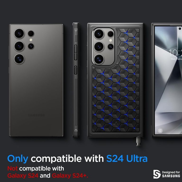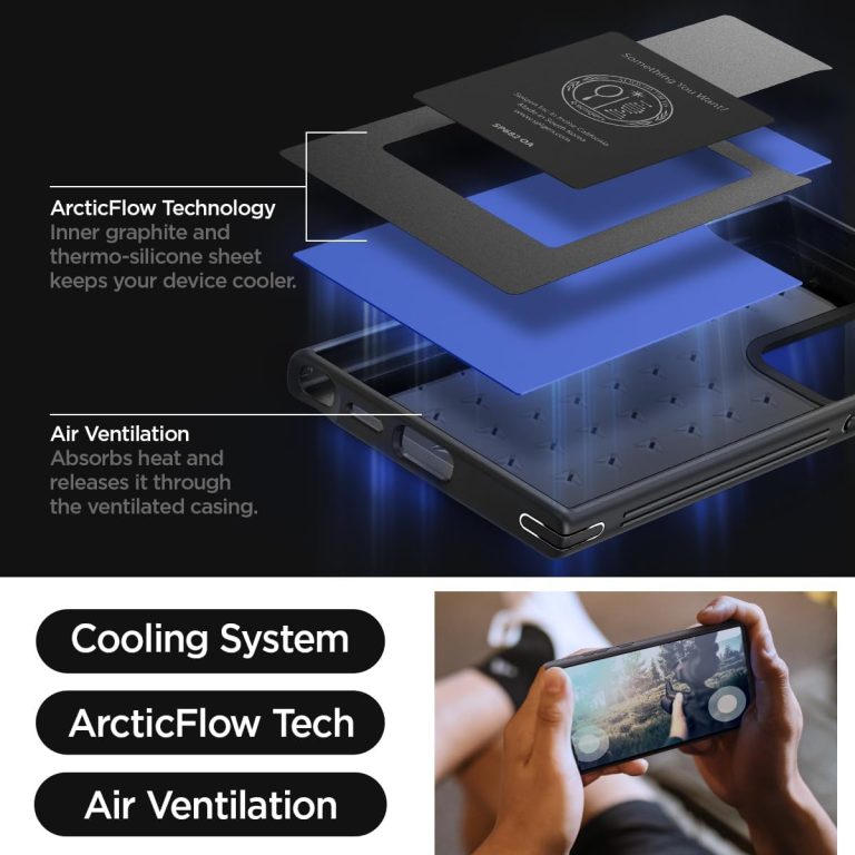 Galaxy S24 Ultra Cryo Armor Case By Spigen is Made from TPU, PC, graphite, and silicone sheets for durability and heat reduction Drop protection via Air Cushion Technology Airflow increased with AirCube pattern. Side grips for optimal horizontal gaming.