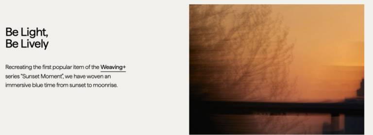Be Light, Be Lively: Recreating the first popular item of the Weaving+series “Sunset Moment”, we have woven an immersive blue time from sunset to moonrise.