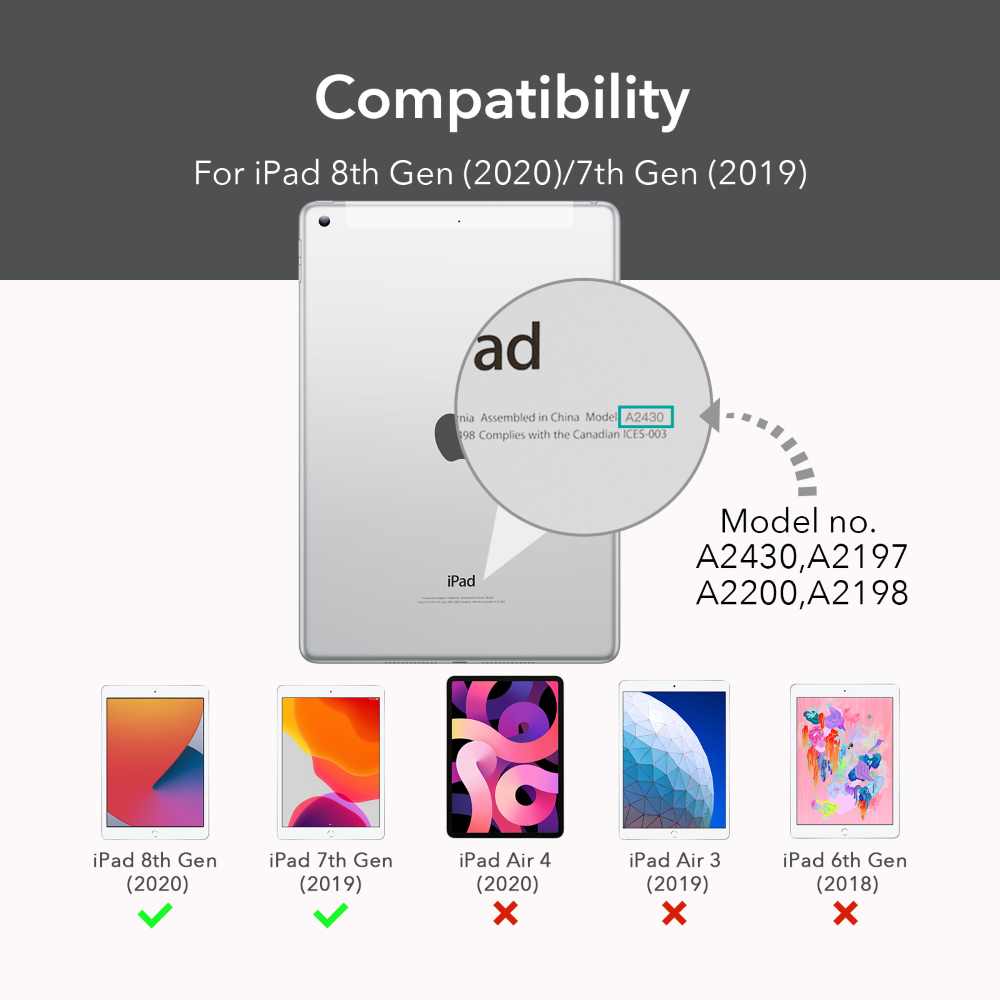 • COMPATIBILITY – Designed for the 10.2″ iPad 8th gen (2020)(Model No.: A2270,A2428, A2429, A2430) and iPad 7th Gen (2019)(Model No.: A2197,A2200,A2198). Not compatible with any other iPad models.