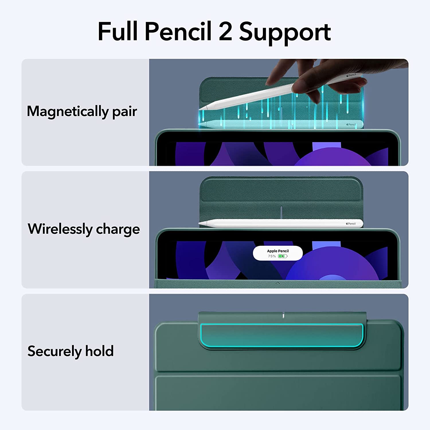 - Pencil 2 Compatible: fully supports Pencil 2 with a thin side panel for magnetic charging and a magnetic clasp to keep it secure