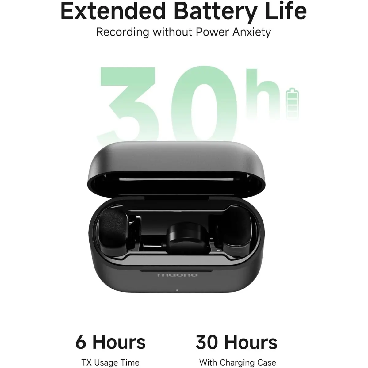 Extended 30-Hour Battery Life: With compact charging case, this small microphone can work for up to 30hours. The receiver allows to charge your device while recording, no more worrying about low battery situation