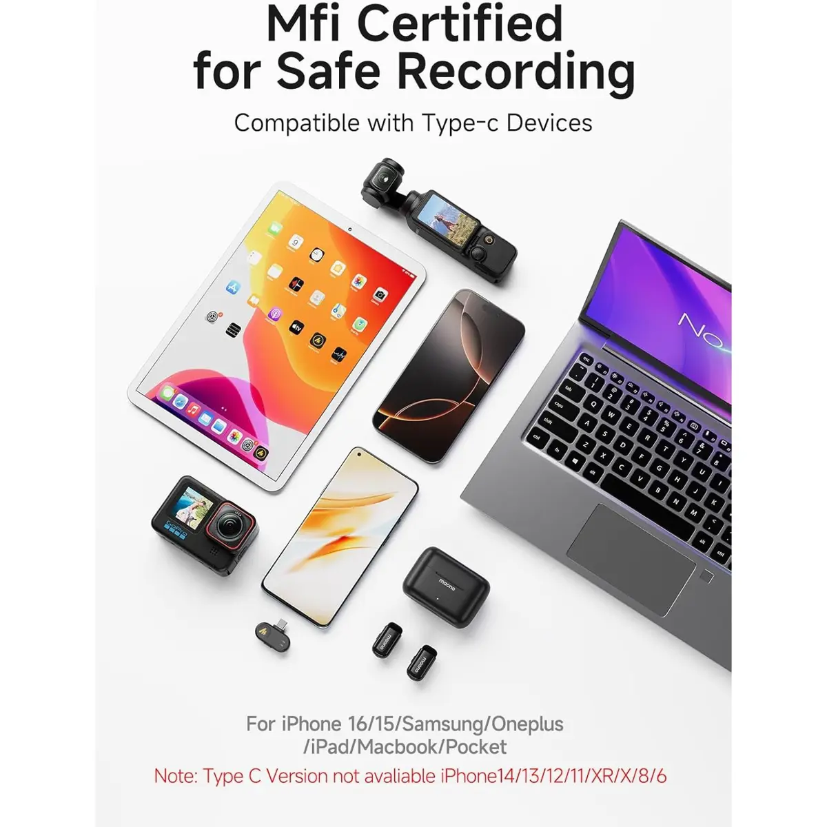 MFi Certified, Secure Recording: Apple-certified USB-C receiver wireless microphone, seamlessly compatible with iOS system, providing interference-free high-quality audio transmission, bringing a reliable recording experience, avoiding the risk of devices overheating, data loss or damage. Note: Please choose the Lightning version for iPhone 14 series and below