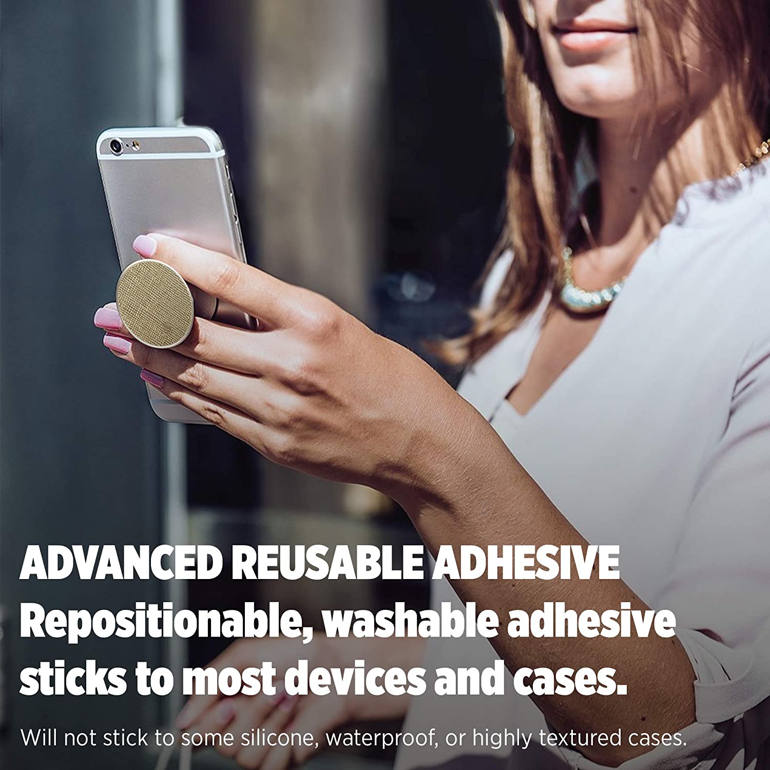 - Repositionable and sticks to most devices and cases (but may not stick to silicone or waterproof cases)