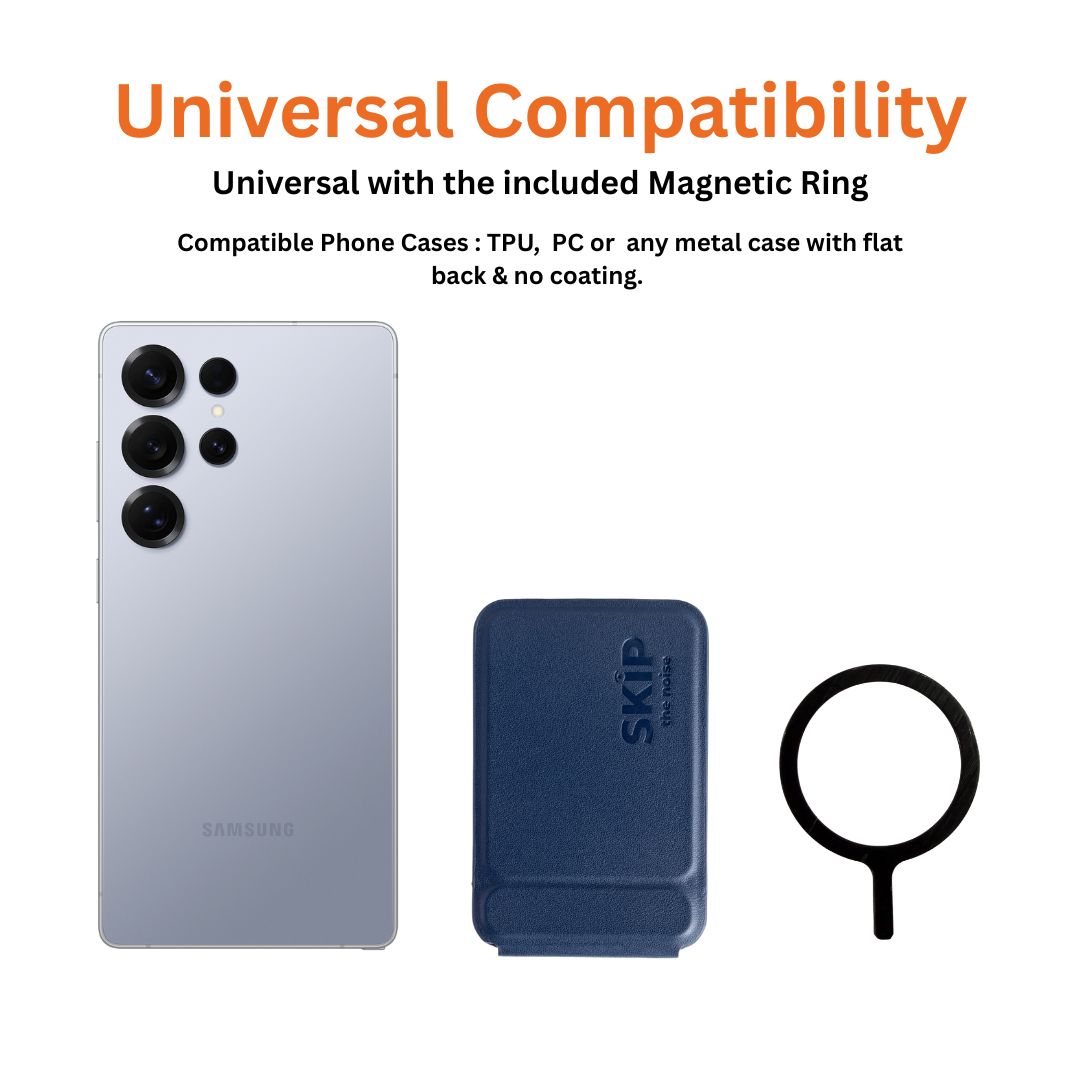 The Skip the Noise Magnetic Tripod Stand & Wallet is a slim, magnetic tripod designed for creators, professionals, and everyday users who want a fast, stable, standing tripod without carrying traditional gear. It works as a tripod, a tripod with stand functionality, and a magnetic phone mount all in one clean design.