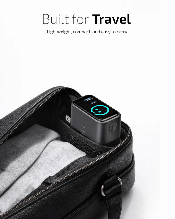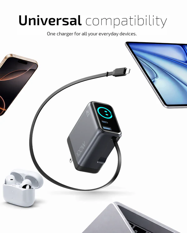 A compact yet powerful charging solution designed to simplify how you power your devices. Featuring advanced GaN technology, an intelligent TFT display, a built-in retractable cable, and foldable plugs, it delivers speed, safety, and convenience in one refined form.