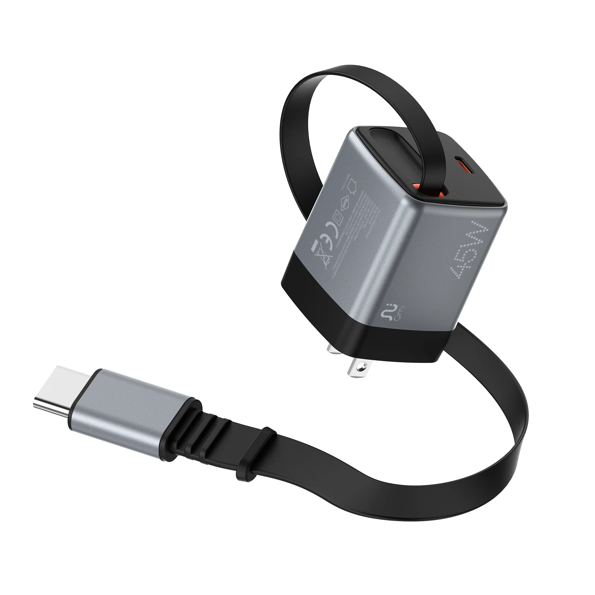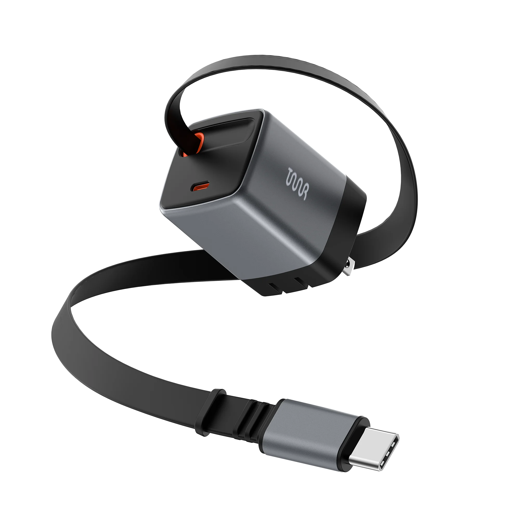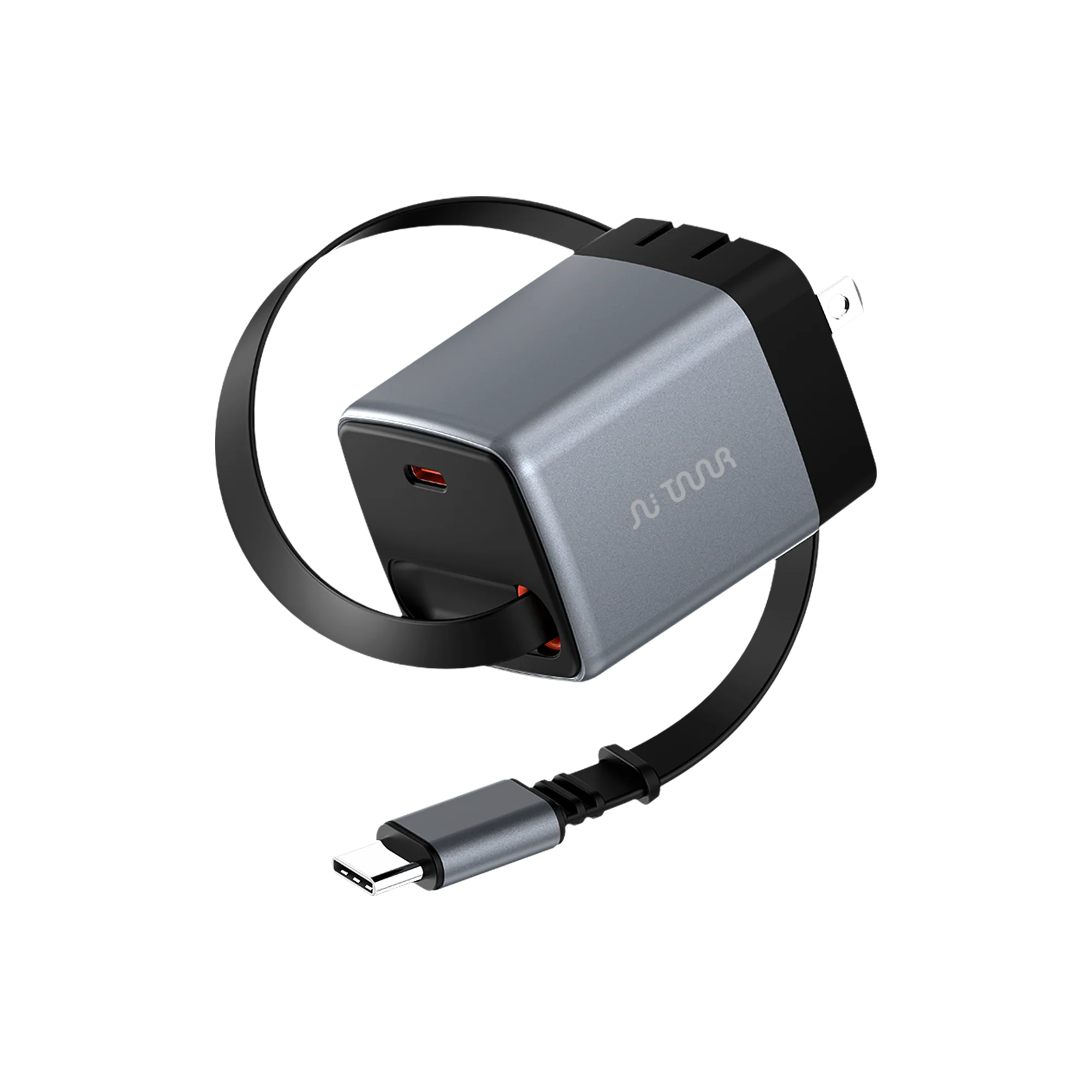 Designed to be 30% smaller than standard chargers, with a foldable plug and built-in retractable USB-C cable.