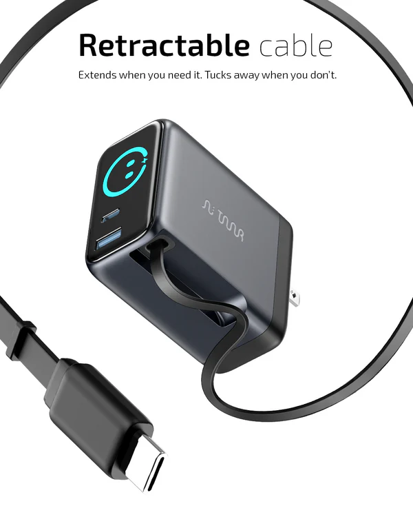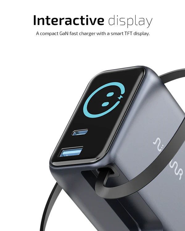 A compact yet powerful charging solution designed to simplify how you power your devices. Featuring advanced GaN technology, an intelligent TFT display, a built-in retractable cable, and foldable plugs, it delivers speed, safety, and convenience in one refined form.