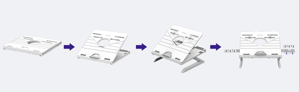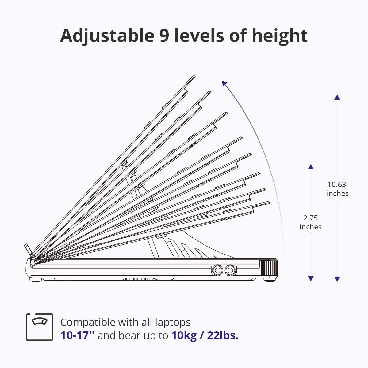 Tronsmart D07 Laptop Stand comes with Adjustable 9 Levels of Height: There are 9 levels of height can be freely adjusted from 2.75 inches to 10.63 inches, providing a perfectly comfortable angle for work.